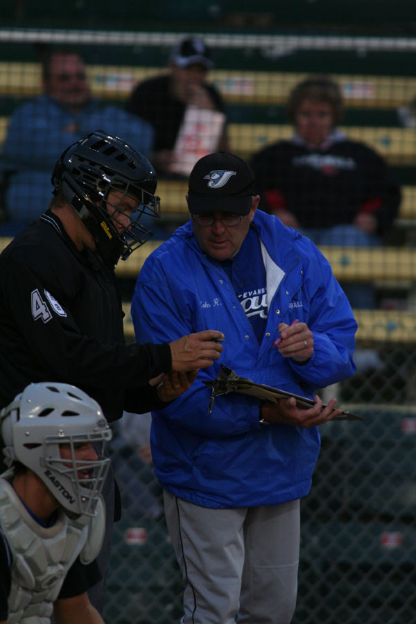Umpire Rob Ruhle and John Rasmussen discussing line-up changes.